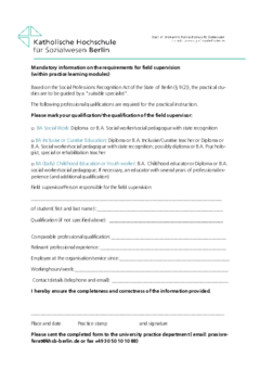 Mandatory information on the requirements for field supervision (within practice learning modules) Based on the Social Professions Recognition Act of the State of Berlin (§ 9(2)), the practical